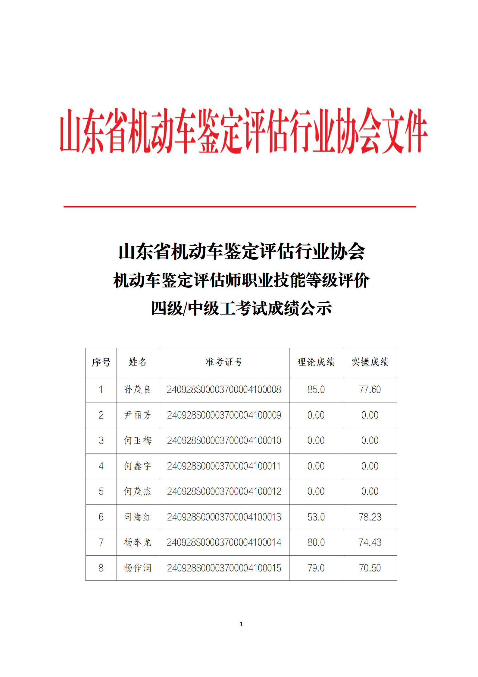 山东省机动车鉴定评估行业协会第十二期中级、第五期高级机动车鉴定评估师职业技能等级认定工作已于2024年9月29日顺利完成,本着公平、公正、公开的原则,现将考试成绩进行公示(详见附件),公示期内,如有异议,可以直接向评价中心反映。